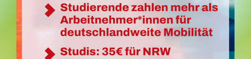 We, the student unions in NRW, demand a solidarity-financed semester ticket with Germany-wide validity at a price of 129 euros per semester, building on the 49-euro-ticket and with a starting date of 1 May 2023.